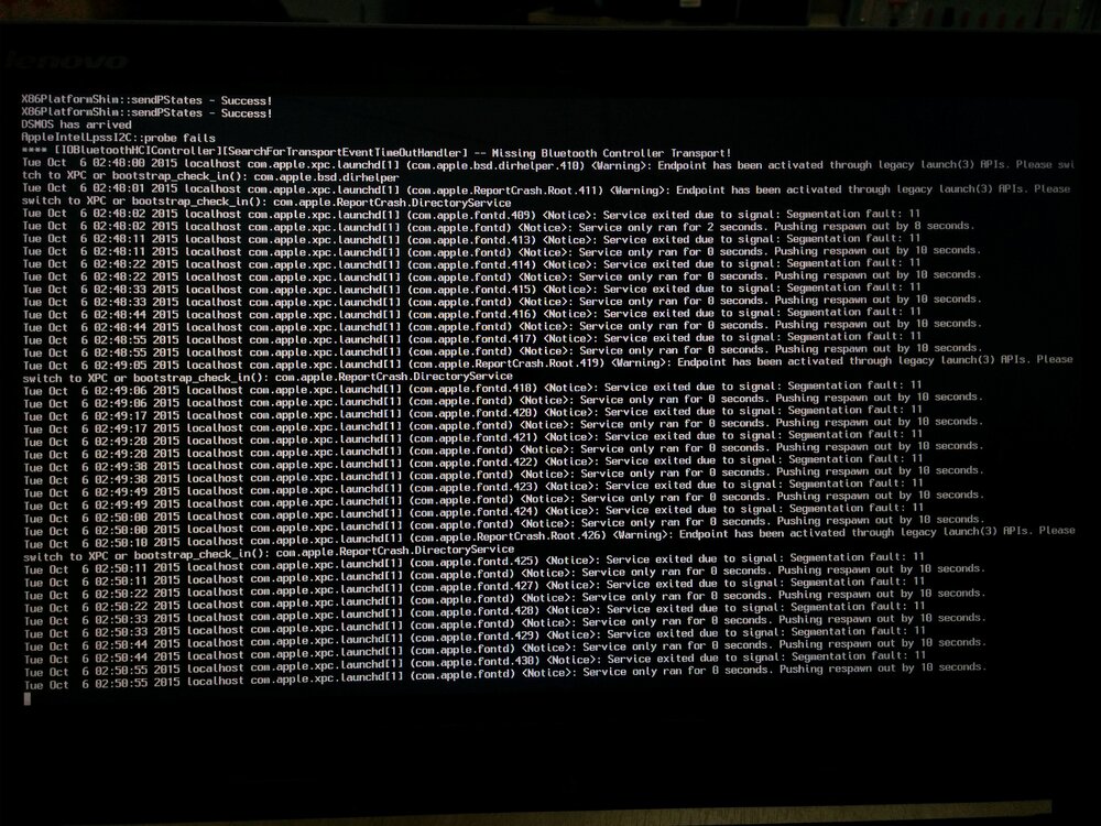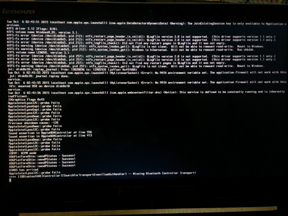 Então fiz coisa errada. Bom, de qualquer forma iniciei do 0. -Refiz o USB inicializável do yosemite -Coloquei a kext Null (pois pelo que pesquisei, meu note precisa dela inicialmente). 1º teste: deu reboot automatico, então resolvi o problema ativando o KernelPM. 2º teste: Ficou na mensagem Missing Bluetooth Controller Transport por alguns minutos, como na imagem abaixo. Depois de uns 2min ficou carregando essas mensagens abaixo sem parar, segue a imagem. -