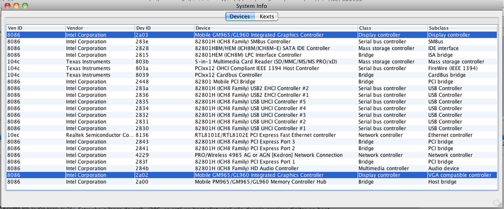 Eu instalei esses kexts por engano mesmo. A instalacao nativa fez quase tudo funcionar. 1 - Os unicos problemas sao o wireless e o monitor. A parte de baixo do monitor fica defeituosa, pois a resolução da minha tela é 1280x800 e o sistema so reconhece 1280x768. Essa parte tá brabo! O Front Row funciona perfeitamente! 2 - Eu vou tentar instalar a Broadcom se tiverem dois slots pci no vaio, pois acho que no windows a broadcom nao funciona. 3 - Outra coisa, se eu clico em maçã->Sobre este Mac nao aparece nada. 4 - Ele nao desliga. Se clico em desligar ele tenta reiniciar. 5 - Como voce editou a dsdt.bin ? Alguma programa especifico? Muito Obrigado pela ajuda. Eu vou tentando, e postando os resultados. Abraço. -