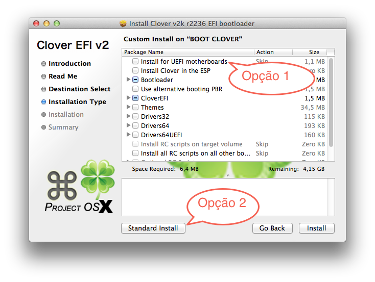 Hoje liguei o PC pra tentar refazer o processo e pra minha surpresa a BIOS se corrompeu... sofreu um rollback e voltou à versão original, mas tudo bem, vou deixar assim por enquanto. Estou seguindo os passos desse link http://www.insanelymac.com/forum/topic/282787-clover-v2-instructions/page-2#entry1868751 pra fazer o boot do Clover em RAID. O negócio é simples, mas tô ficando confuso. Pelo o que entendi tenho que formatar um pendrive em FAT32 e instalar o Clover nele, só o Clover. Baixei essa versão: v2k_r2236. Esse serve ou tem que ser outro? Se for esse, qual opção uso: Uso a primeira ou a segunda opção?
