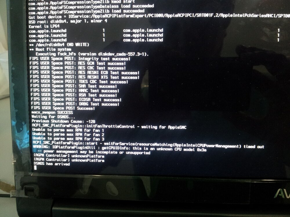 Hello guys! Troquei de notebook para o Avell G1511, segue espec: Nome da Placa Mãe Clevo W35_37ET Tipo de processador Mobile QuadCore Intel Core i7-3740QM, 2700 MHz (27 x 100) South Bridge: Intel Panther Point HM77 PCI Express 3.0 x16: nVIDIA GeForce GTX 660M (Clevo) Intel® HD Graphics 4000 ------------------------------------------------------------------------ Instalei o ML 10.8.2 de acordo com o tutorial do Cassio. Boot somente pelo Chameleon, Clover trava. No Chameleon, consegui instalar o ML no HDD setando: "-v -x GraphicsEnabler=No -f" Após a instalação, consegui iniciar setando: "-v -x" ou "-v -x GraphicsEnabler=Yes" Outras tentativas: "-v -x GraphicsEnabler=No" - DSMOS Arrived sem gráfico (conforme imagem em anexo) "-v" - DSMOS Arrived sem gráfico (conforme imagem em anexo) "-v GraphicsEnabler=Yes" DSMOS Arrived sem gráfico (conforme imagem em anexo) "-v GraphicsEnabler=No" DSMOS Arrived sem gráfico (conforme imagem em anexo) "-v -f" - DSMOS Arrived sem gráfico (conforme imagem em anexo) "-v UseKernelCache=No" DSMOS Arrived sem gráfico (conforme imagem em anexo) "-v -f" DSMOS Arrived sem gráfico (conforme imagem em anexo) "-v -f UseKernelCache=No" - DSMOS Arrived sem gráfico (conforme imagem em anexo) "-v npci=0x3000 ou 2000" - DSMOS Arrived sem gráfico (conforme imagem em anexo) Foi instalado o FakeSmc e o Nullpowermanagement com o Kext Wizard, dps dado rebuild perm./cache. O problema é que só consigo iniciar pelo Safe Boot (-x). Imagens do boot: