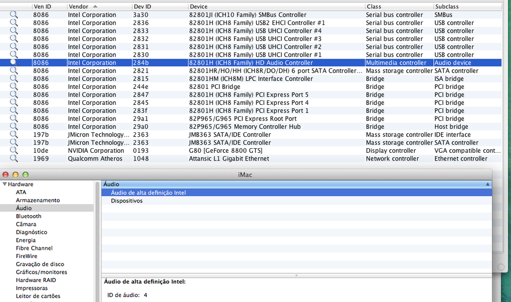 @Mirone a aplpehda continuam sem carregar ao iniciar, fica apenas a hdacontroller, se tentar carregar a applehda pelo kextload ela carrega sem problema, se descarregar = no entanto nunca consigo descarregar a hdacontroller, dá o seguinte erro sudo kextunload -v /System/Library/Extensions/AppleHDA.kext/Contents/PlugIns/AppleHDAController.kext/ (kernel) Can't unload kext com.apple.driver.AppleHDAController; classes have instances: (kernel) Kext com.apple.driver.AppleHDAController class AppleHDAController has 1 instance. (kernel) Kext com.apple.driver.AppleHDAController class AppleHDAWorkLoop has 1 instance. Failed to unload com.apple.driver.AppleHDAController - (libkern/kext) kext is in use or retained (cannot unload). Não sei se ajuda alguma coisa... mas esta acontecendo isso...