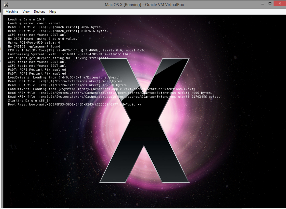 2. Ran into a hiccup when trying to install Mac Osx. I followed the instructions from http://lifehacker.com/5938332/how-to-run-mac-os-x-on-any-windows-pc-using-virtualbox. And it hung at this screen