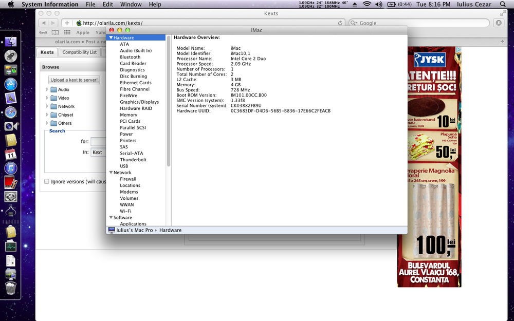 1. Hello guys, this is my first post here, so please be kind to me. I'm not new to hackintoshing, but recently i "custom built" a laptop especially for running mac. It is a dv6700 series with a t8100 CPU, 8400m gs 256 mb GPU and 4 gb ram,and it uses ICH8M chipset. I started my journey with snow leopard , moved to lion, and finally to mountain lion, and was determined to stick to ML, until i found that they removed shortcut keys for contrast and black on white settings, and guess that many other. Decided to keep lion on this rig, and make it work perfect, and i mean perfect and with as much "vanilla flavor" i can. I can't afford a real mac laptop, nor a different laptop that has better compatibility. I plan on upgrading this laptop, until there isn't much to upgrade. A t9500 cpu is planned, illuminated keyboard from another hp with same keys layout , a 1900x1200 lcd panel , and finally the GPU change if it's possible( the 17" uses 512 mb GPU). Let's get started: Using iATKOS L2 dmg transferred to a 8gb usb, i installed using these options: Chimera 1.6, Graphics Enabler, Built-in Ethernet, FakeSMC , AHCI Sata , CPU & NVIDIA GPU HW Sensors, PS/2 and Laptop Battery. I haven't installed Disabler, RTC patch or EV0Reboot. THE SYSTEM BOOTED FINE. What is working : Graphics acceleration, usb , battery , cpu throttler, touchpad, keyboard , touch keys, wireless BCM43. What isn't working: Sleep, sound, shutdown, reboot, HDMI, ethernet, card reader, graphics card gpu throttler. Yes it is buggy, but it has speed, and because i hate windows i will stick to hackintosh until i'll have the money to buy a real macintosh . Let the fun begin: I want to patch my DSDT and make everything working. However, after searching up and down the web, there are tons of DSDT patching but mostly to gigabyte mobos, and not suitable to noobs. I tried and failed numerous times to edit DSDT and kexts to make it work, until i decided to ask you for help. I have original DSDT, and SMBIOS and other extracted from windows, and the basic software for this. I also have snow leopard 10.6.3 installed onto a external HDD and a vga monitor for easy management of windows. There is an issue with the fsb detection that i would like to correct somehow, because smbios edit doesn't make any difference. The fsb has 728 instead of 800 , and ram 607 instead of 667. Booting with "Wait=Yes" flag confirms this. If any way to correct, it will make my cpu go faster not at 1.911 Mhz like now. If there is someone out there that is willing to help me make things work, and ultimately helping others , i'm sure there will be some way to thank you for the help. I'm attaching my original dsdt, with smbios,and acpidump, along with some screen captures. Thank you again! bios related.zip