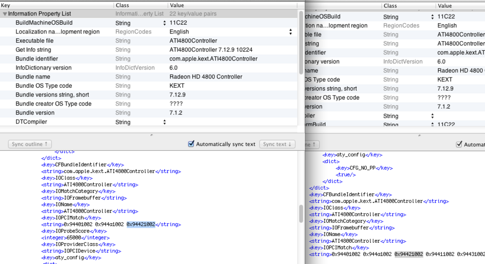 7. O ID vai ser 0x94421002 correto? Edit: Verifiquei a pasta S/L/E e haviam lá um ATI4800Controller.kext.bak e um ATI4800Controller.kext. Em ambas as info.plist o ID já estava. Imagem em anexo.