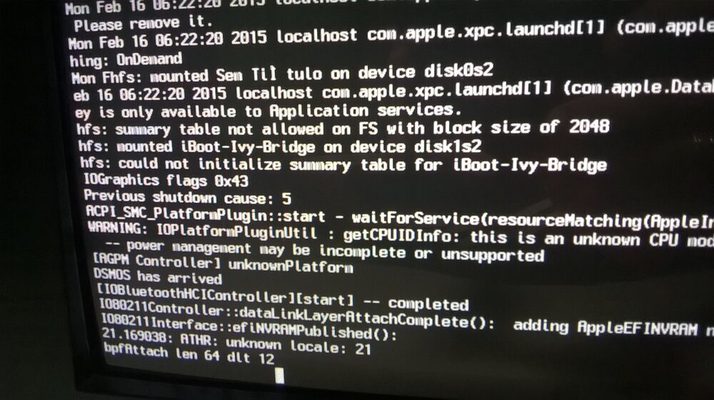 3. Ola sou novo e ja conseguiu instalar o Mac no pc mas consegui o 10.6.8.... Td certinho tenho o cd original do 10.6.3 Agora queria atualizar para o 10.10 e não consigo ja baixei da appstore e usei o unibest e tentei com varias comandos mas não vai trava e não sobe o instalador do Os X Trei uma foto do modo verbose dessa parte não sai nem a pai ja deixei hrs pra ver se era lerdeza do pc mas não é .
