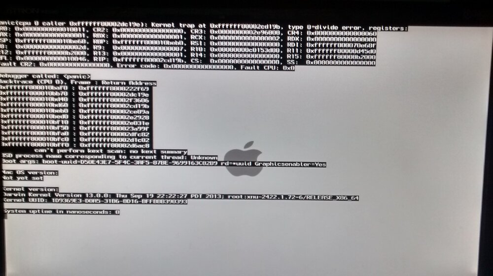 2. Pessoal bom dia, alguém pode me ajudar? Estou tentando instalar o OSX Mavericks via pen drive com o MyHack, mas esta parando na tela branca com a maçã e não sai disso, já tentei várias boot flags, mas sem sucesso, segue as configurações da minha máquina, e telas no modo verbose: Placa Mãe = Pegatron IPM41-D3 Processador = DualCore Intel Core 2 Duo E4600, 2400 MHz (12 x 200) Memória = 4 GB Corsair Venegeance Placa de Vídeo = nVIDIA GeForce GT 520