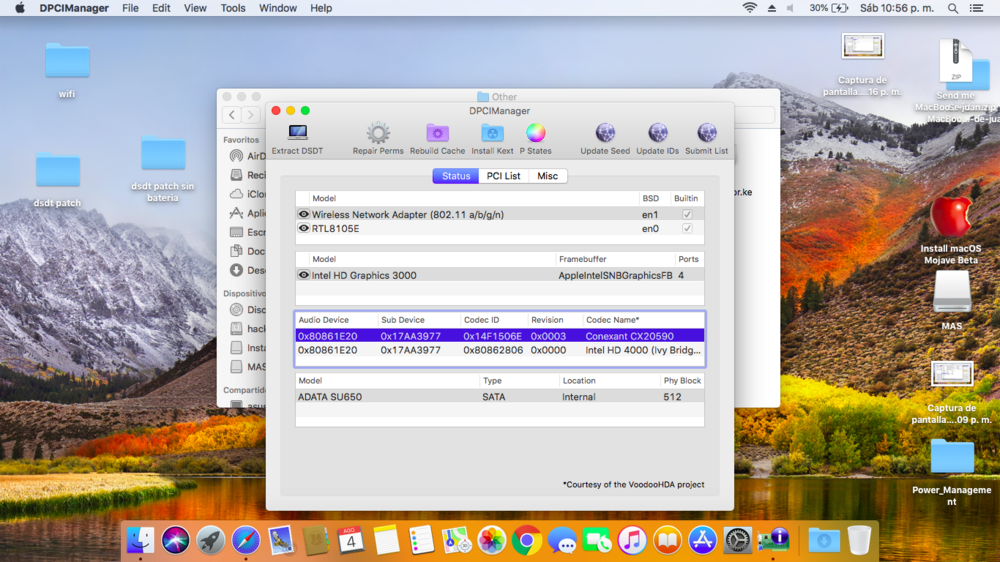 Hello everyone, I need help for DSDT, I try to do a part, but I still have problems I have a lenovo ideapad u310 with i3 2367m core processor sandybridge graphics hd3000 4gb ram ssd adata so far some things work but others do not like sound, no wifi, do not go into suspension, and sometimes it stays stuck and I have to restart forced could you help me I would appreciate it is the first time I try this hackintosh I have also read that I need a ssdt could you help me with that too thanks archives program run https://drive.google.com/open?id=1HYZKV-kI0nMdJeVcpLdw6FaoKtWqmg0e