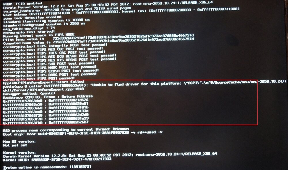 Olá Artur obrigado pela resposta! Pois é, sei que dsdt nao é milagre, mas estou preferindo acertar as coisas o maximo possivel na dsdt para evitar a instalação de muitos enablers ou kexts desnecessarias, Para dizer a verdade, estou gostando de brigar com esses erros porque estou aprendendo muito com isso. Me animei depois que ví esse video com um 980x funcionando perfeitamente. "> Minha ultima tentativa foi extrair novamente dsdt e , num primeiro momento, fiz a patch com o arquivo recomendado no forum para minha placa, coloquei a dsdt na raiz e fiz um experimento de boot com o cd , onde deu kp de novo...rs unable to find a driver for this platform acpi/ AppleACPCIplataformExpert, panic cpu e erro de driver Eu nao tinha lido esse tópico que voce passou, mas eu ja tinha instalado com o kext wizard o fakesmc.kext e o nullcpupowermanagement.kext antes de testar esse boot, falta mais algum? tem alguma coisa que eu estaria esquecendo de fazer quanto ao gerenciamento de energia na bios? abaixo a tela de erro, agradeço a ajuda. -