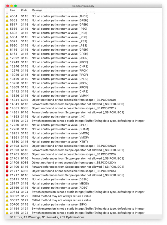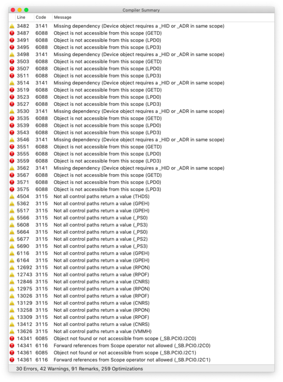 [ref]MaLd0n[/ref], so, I'm trying to patch my origin DSDT (got it from booting Clover). I decompiled it with command "iasl -dl DSDT.aml SSDT*.aml", then opened in MaciASL resulted *.dsl file, added sources to VoodooI2C, clicked "Patch" -> "I2C Controllers" and got an error: When I tried to apply "GPIO Controller Enable" (not after attempt to "I2C Controllers") it compiled without errors, then I saved result .aml file to Clover/patched but nothing happened. So I'm completely confused. I decided to use origin file because I thought your patched won't fit to it, but I think there would not be any difference Though, I'm not sure if my discrete graphics disabled or not. Really needs only touchpad working well. --- Ah, cool, earphones don't work normal anymore: there is audio, but it's not possible to hear voice, only with balance to right or left. In Windows earphones work normally (I rolled back to last version you had sent me)